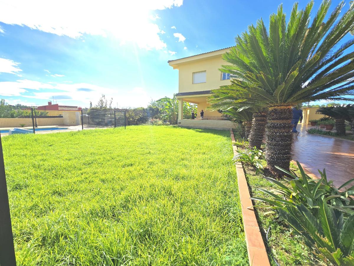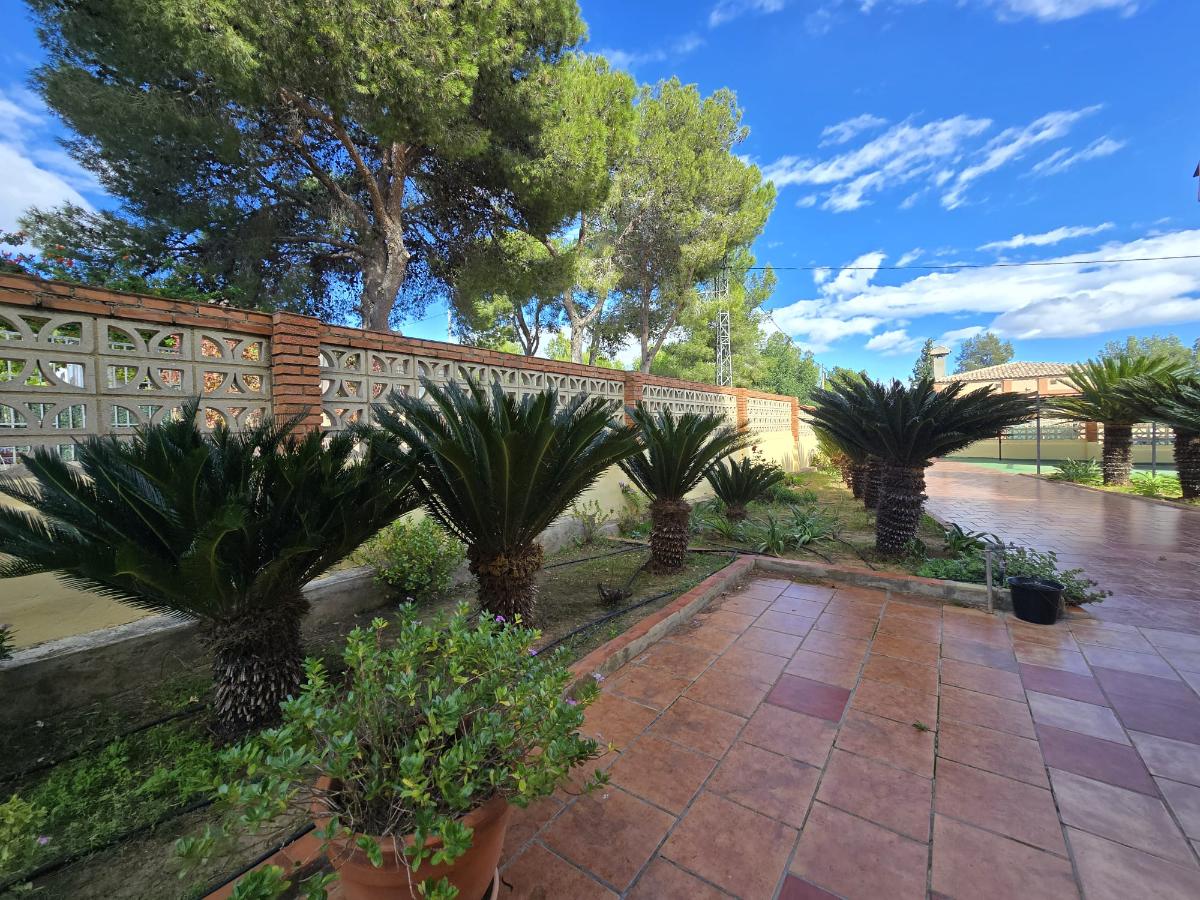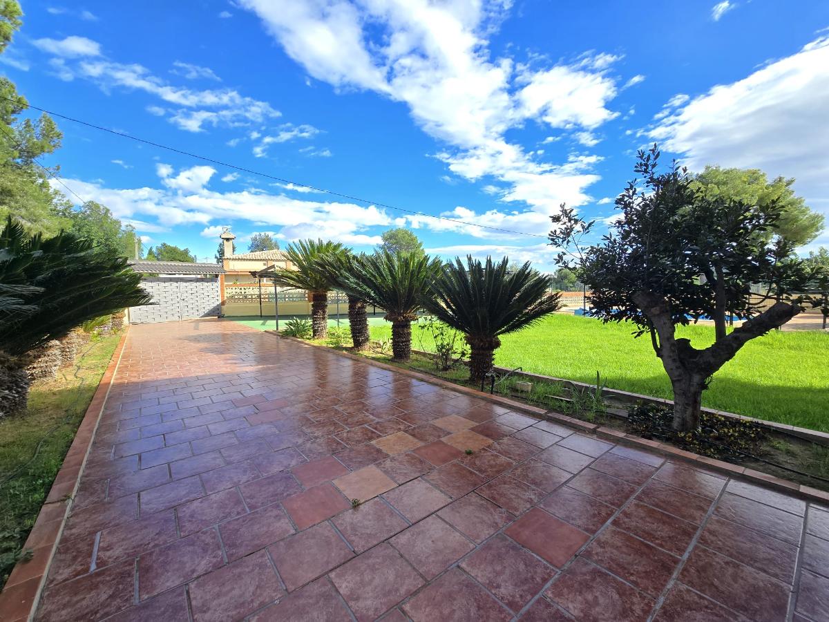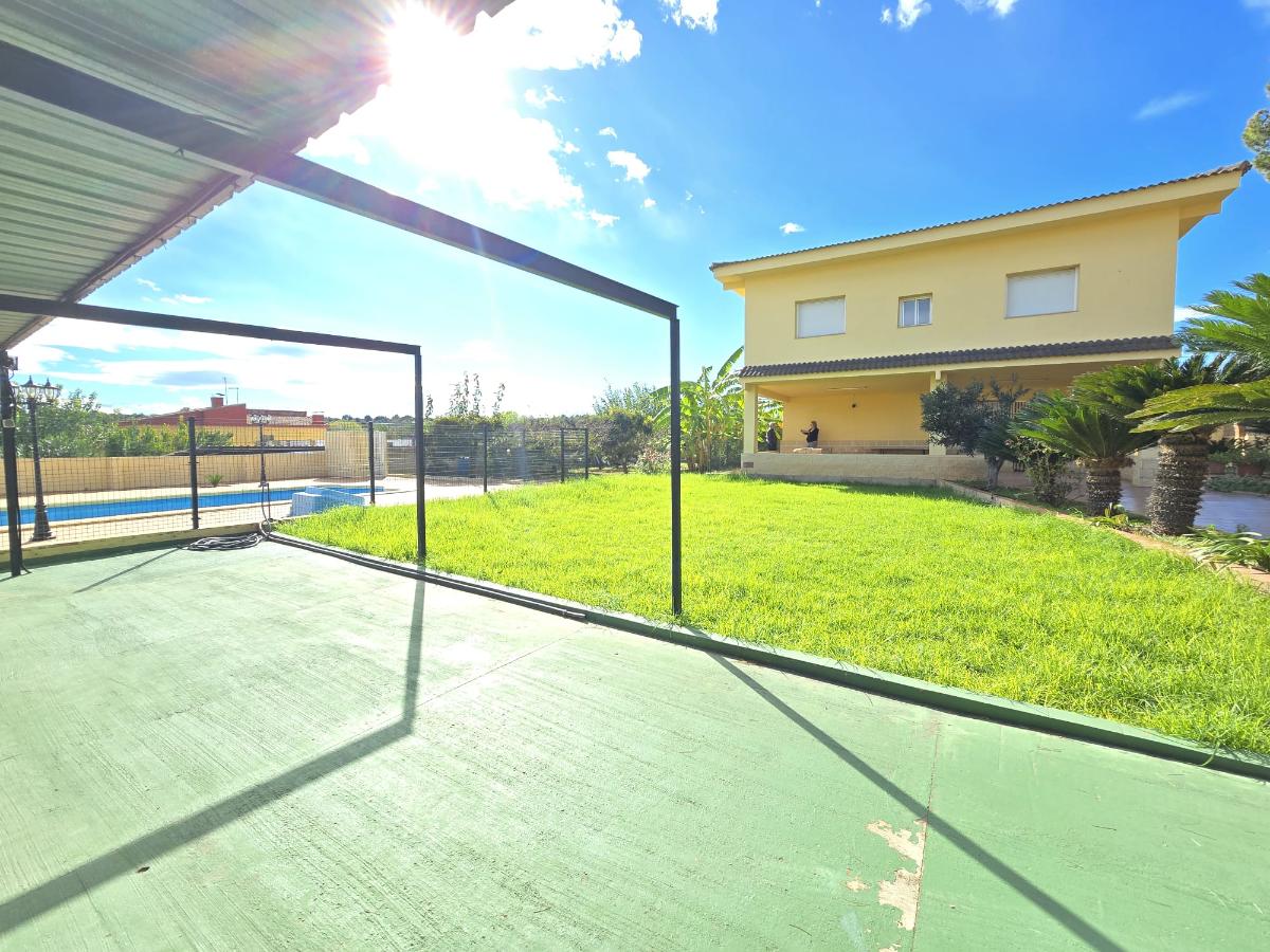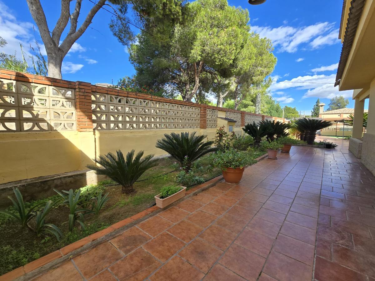 En la zona exterior encontramos una magnífica piscina privada rodeada de amplias zonas de ocio y descanso, un porche con capacidad para cuatro coches, dos paelleros (uno cubierto y otro descubierto) perfectos para reuniones familiares y sociales, un bonito jardín con césped natural y un huerto con árboles frutales y especies exóticas. Además dispone de calefacción central, puerta motorizada automática de acceso a la parcela y cerramientos de aluminio blanco con Climalit para un óptimo aislamiento térmico y acústico.