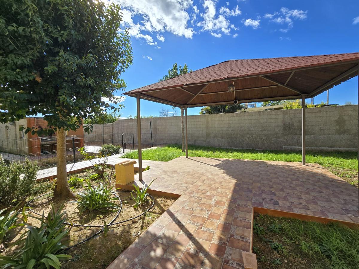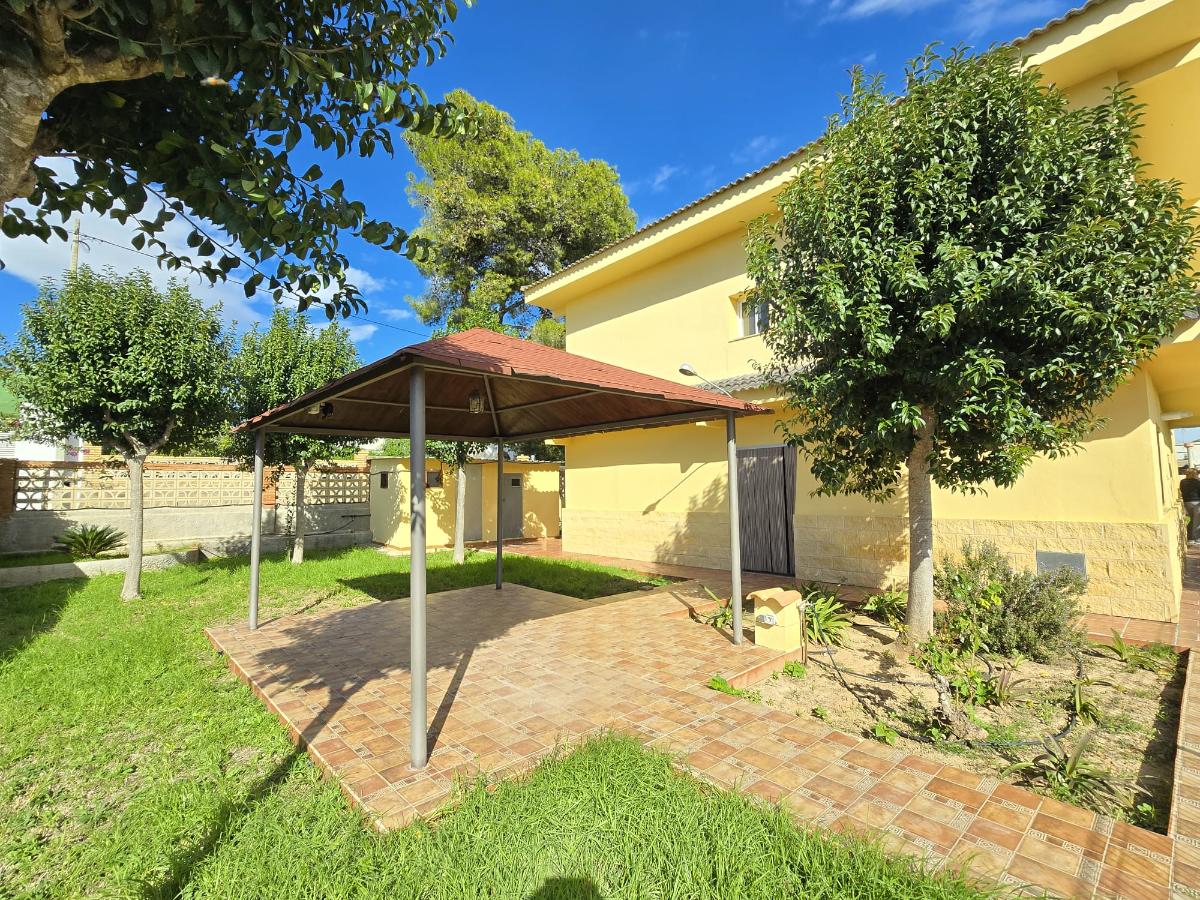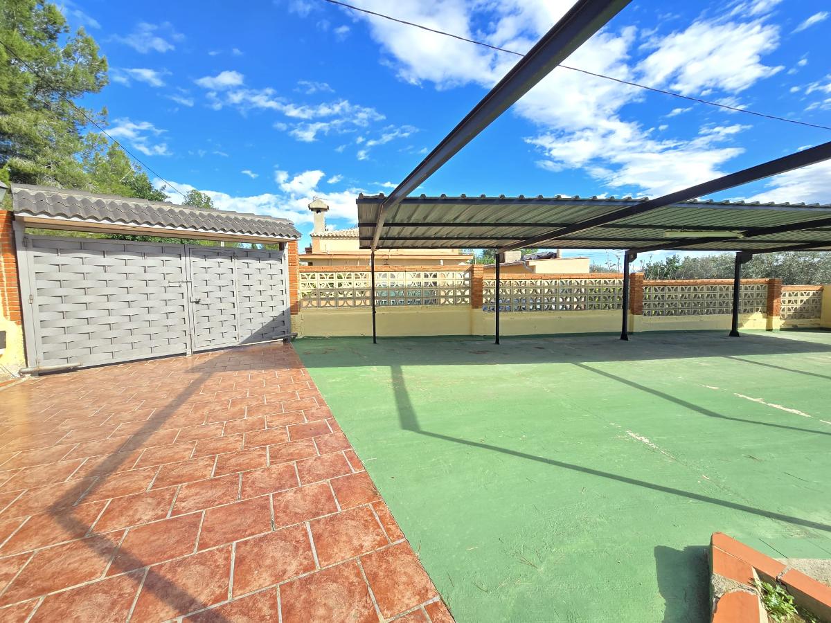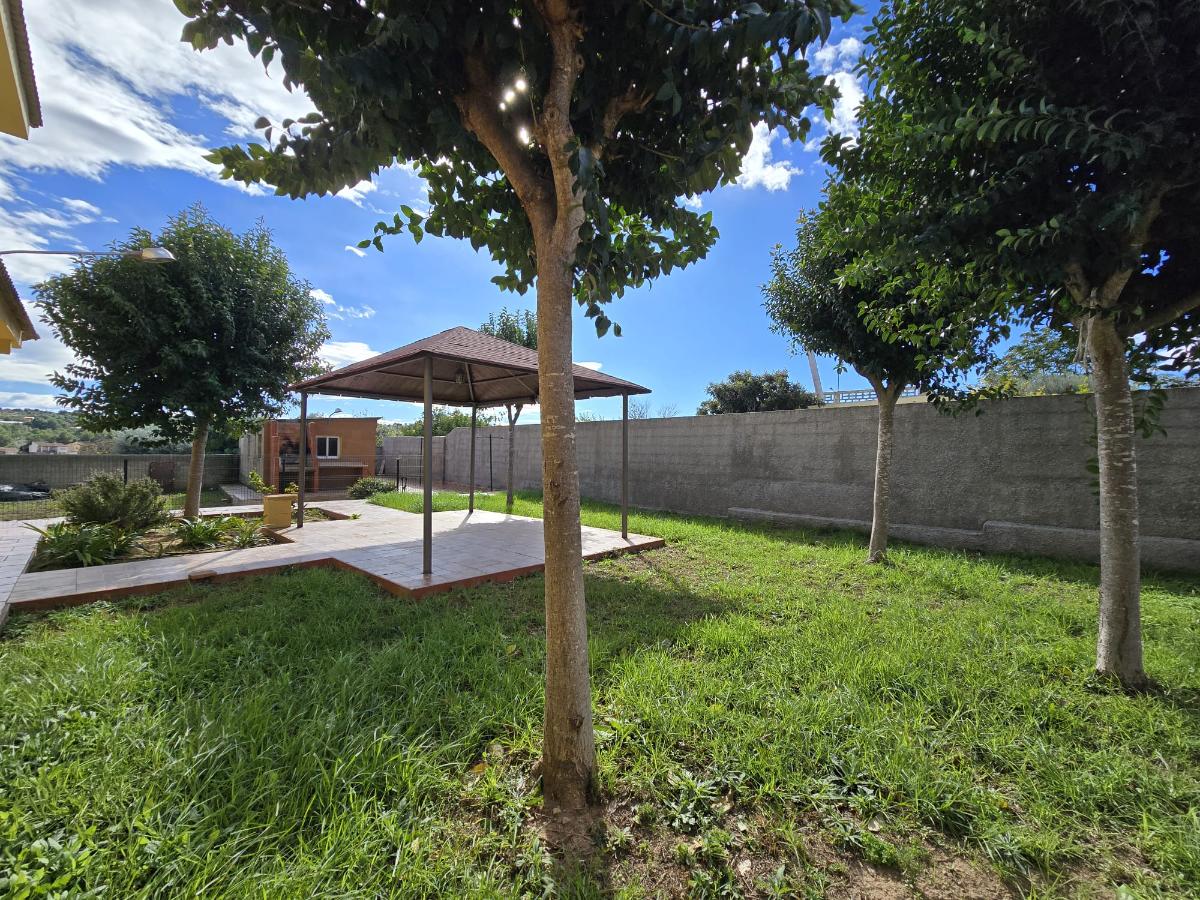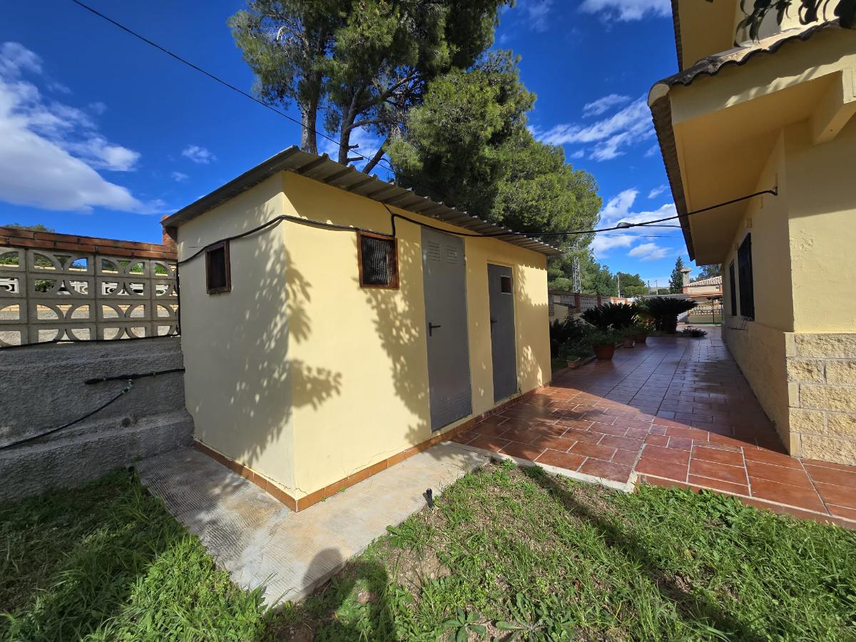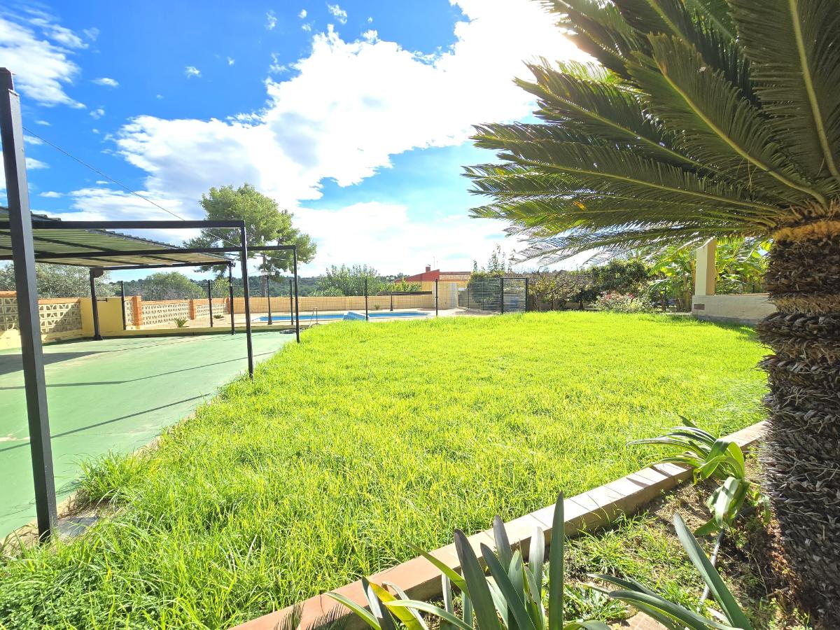 En la zona exterior encontramos una magnífica piscina privada rodeada de amplias zonas de ocio y descanso, un porche con capacidad para cuatro coches, dos paelleros (uno cubierto y otro descubierto) perfectos para reuniones familiares y sociales, un bonito jardín con césped natural y un huerto con árboles frutales y especies exóticas. Además dispone de calefacción central, puerta motorizada automática de acceso a la parcela y cerramientos de aluminio blanco con Climalit para un óptimo aislamiento térmico y acústico.